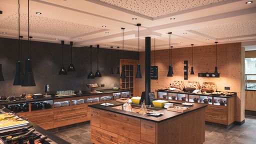 Frühstück mit Bioecke, Eiern und Milch von den regionalen Bauernhöfen, frische Brotsorten sowie frisch gepresste Fruchtsäfte und vieles mehr, das großzügige